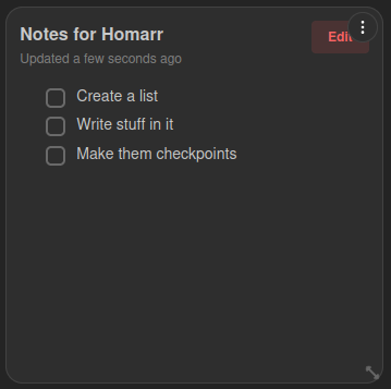 The Anchor Note widget shows a selected note from your Anchor integration. If your note permissions allow it, you can also edit the note title and content directly in Homarr.